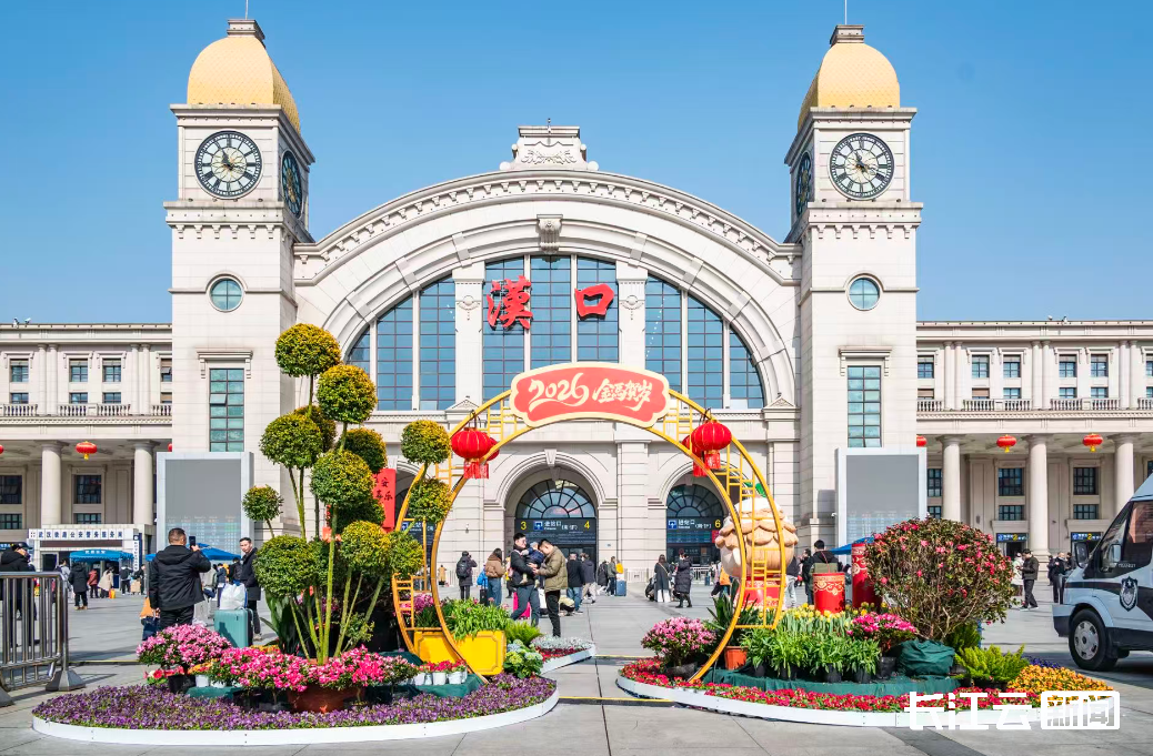 角堇、报春、紫罗兰、郁金香、茶梅球与亮晶女贞球错落有致,争奇斗艳。鲜花丛中,换上唐装、手持灯笼的“松仔”憨态可掬,孩子们争相与牵手合影;拖着行李箱的旅客也纷纷停下脚步,掏出手机记录这抹亮色。一位归乡的旅客感慨:“刚下火车就看到这么喜庆的布置,一下子就有过年的感觉了。‘逛江汉 过大年’,这个邀请我收下了!”