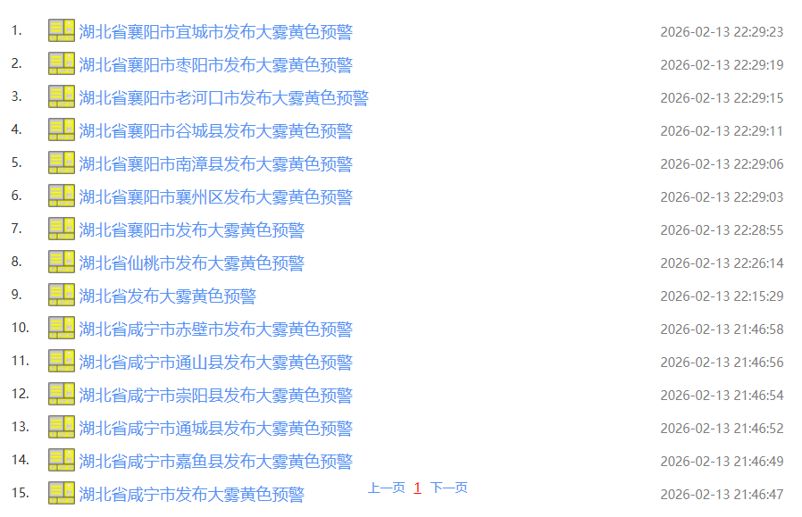 襄阳市气象台2026年02月13日22时28分发布大雾黄色预警信号:预计14日凌晨至上午,襄阳市区、襄州、枣阳、宜城、南漳、谷城、老河口部分乡镇(街道)将出现能见度小于500米,局部小于200米的雾,请注意防范。