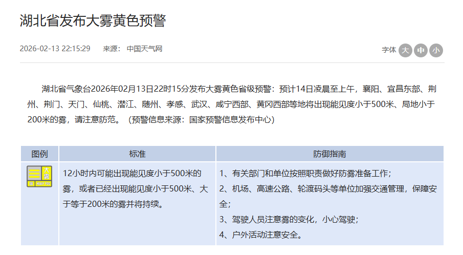 湖北省气象台2026年02月13日22时15分发布大雾黄色省级预警:预计14日凌晨至上午,襄阳、宜昌东部、荆州、荆门、天门、仙桃、潜江、随州、孝感、武汉、咸宁西部、黄冈西部等地将出现能见度小于500米、局地小于200米的雾,请注意防范。
