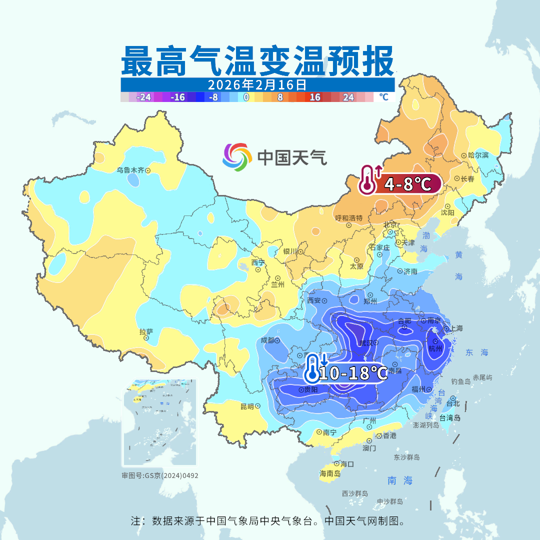 大回暖正在进行中,今天(2月14日)黄淮以南将有大片20℃出现,将创今年以来气温新高。不过,大降温也在酝酿中,15-16日中东部将进入降温主要时段,多地单日气温降幅将超10℃!冷空气南下也让雨雪增强,大雨、暴雪即将来袭。