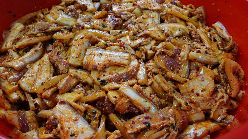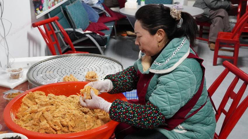 除了炸皮的火候把控,食材的选择与处理同样丝毫不能马虎。刘长明介绍,扣肉所用的梅干菜是当地村民秋收后采摘新鲜萝卜菜、菜薹,经晾晒腌制而成,既保留蔬菜本味清香,吸饱肉汁后更显鲜香解腻。