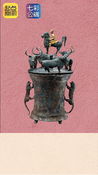 束腰圆筒形,器身两侧对称雕铸虎形耳,平底,底有三个虎爪形足。器盖正中铸有一个鎏金骑 士,头梳椎髻,腰佩长剑,穿紧身衣裤。通体鎏金,显然是身份显赫。其坐骑之马昂首挺身,张口,翘尾,显得十分威武。盖周立雕四牛,腰肥体壮,抬头垂尾做行走状。整个器物装饰题材由动物到人物,或高或低,错落有致。