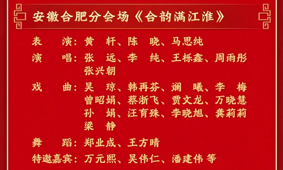 此外,在安徽合肥分会场节目《合韵满江淮》中,“梅花奖”得主、湖北省京剧院一级演员万晓慧也将在戏曲环节演绎京剧经典《状元媒》片段,以“柴郡主”形象展现国粹芳华。