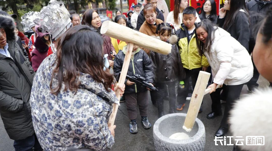 图:咸丰坪坝营推出非遗迎宾、年俗体验,游客沉浸式参与捣糍粑