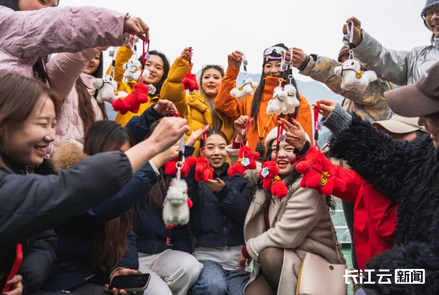 图:大年初一的游船上,恩施大清江为游客送上红色小马挂件,并致以“新年快乐,马年大吉”的祝福