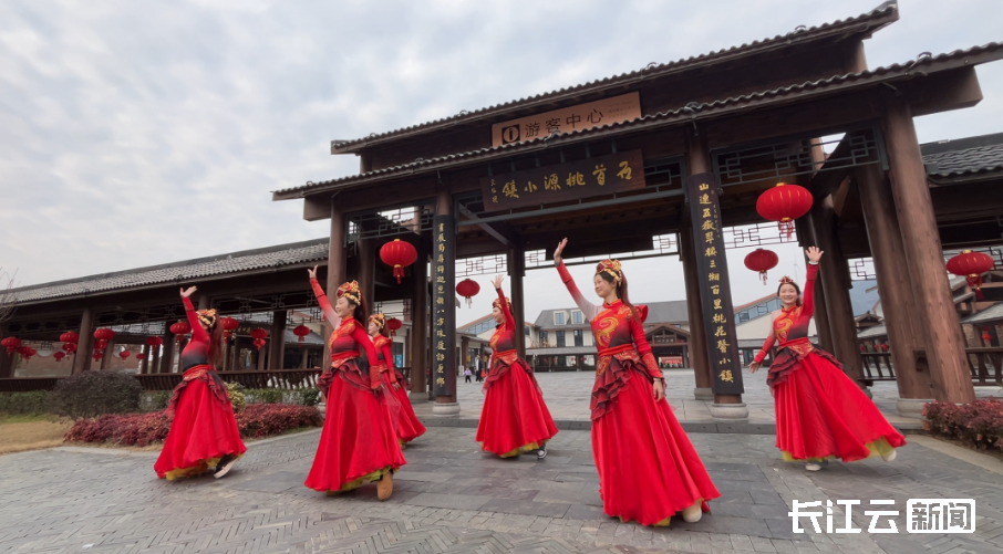 图:石首桃源小镇演出人员表演开场迎宾舞蹈