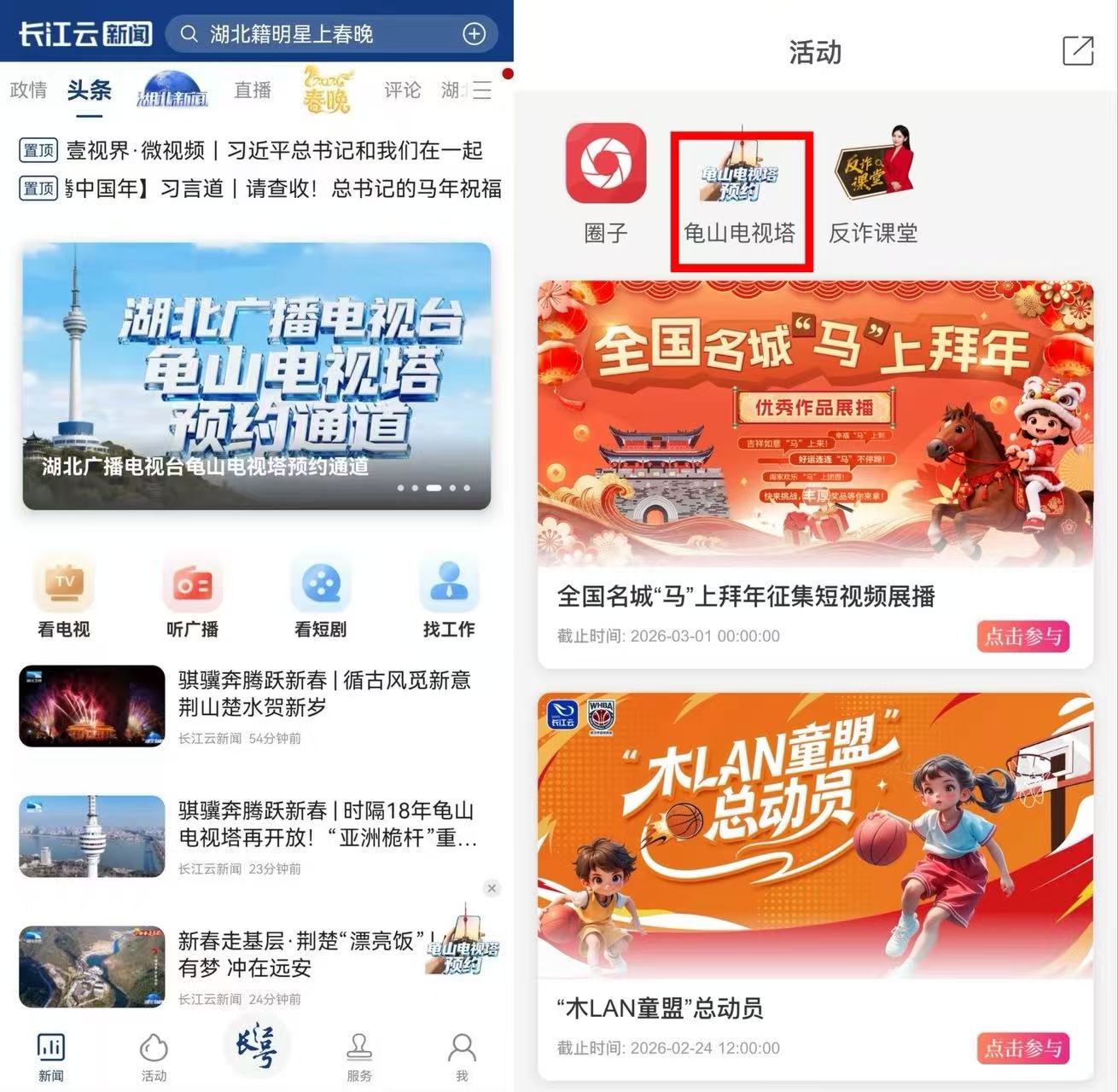 想要预约登塔的游客,请下载长江云新闻客户端,首页点击【龟山电视塔预约通道】头图,或者点击【活动】,进入龟山电视塔预约通道。