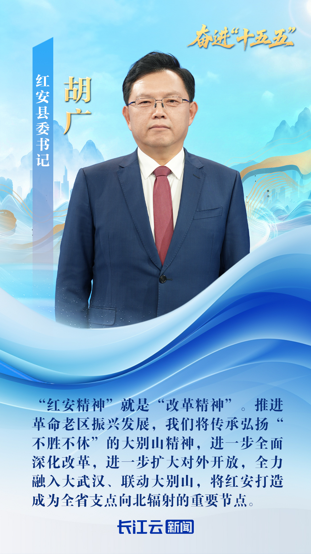 红安县委书记 胡广:红安当前主要有三大核心任务:一是牢记总书记殷殷嘱托,加快建成大别山革命老区“两个更好”振兴发展先行区;二是大力弘扬大别山精神,以红色赋能湖北的支点建设,增强红色文化的育人功能;三是落实省委支点建设的战略部署,千方百计提升县域经济规模和能级,千方百计增加老区人民的收入。这些年来,我们始终把增进民生福祉放在首位,将八成以上的财政支出投向了民生领域,加快推进就业、教育、医疗、养老等民生实事,老区群众的日子越过越有滋味。2025年我们全体居民和农村常住居民人均可支配收入的增速均为黄冈市第一,还代表湖北省顺利接受巩固拓展脱贫攻坚成果国家后评估考核,老区群众的获得感、幸福感、安全感不断增强。