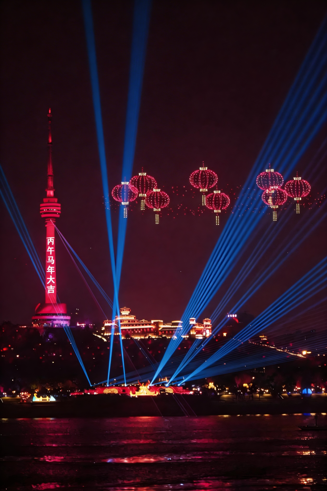 灯笼阵列的中心,“马年大吉”四个大字熠熠生辉,与塔身同步亮起的“丙午马年大吉”遥相呼应,仿佛一场千年灯火与今人科技隔空重逢,马不歇,年味更不息。