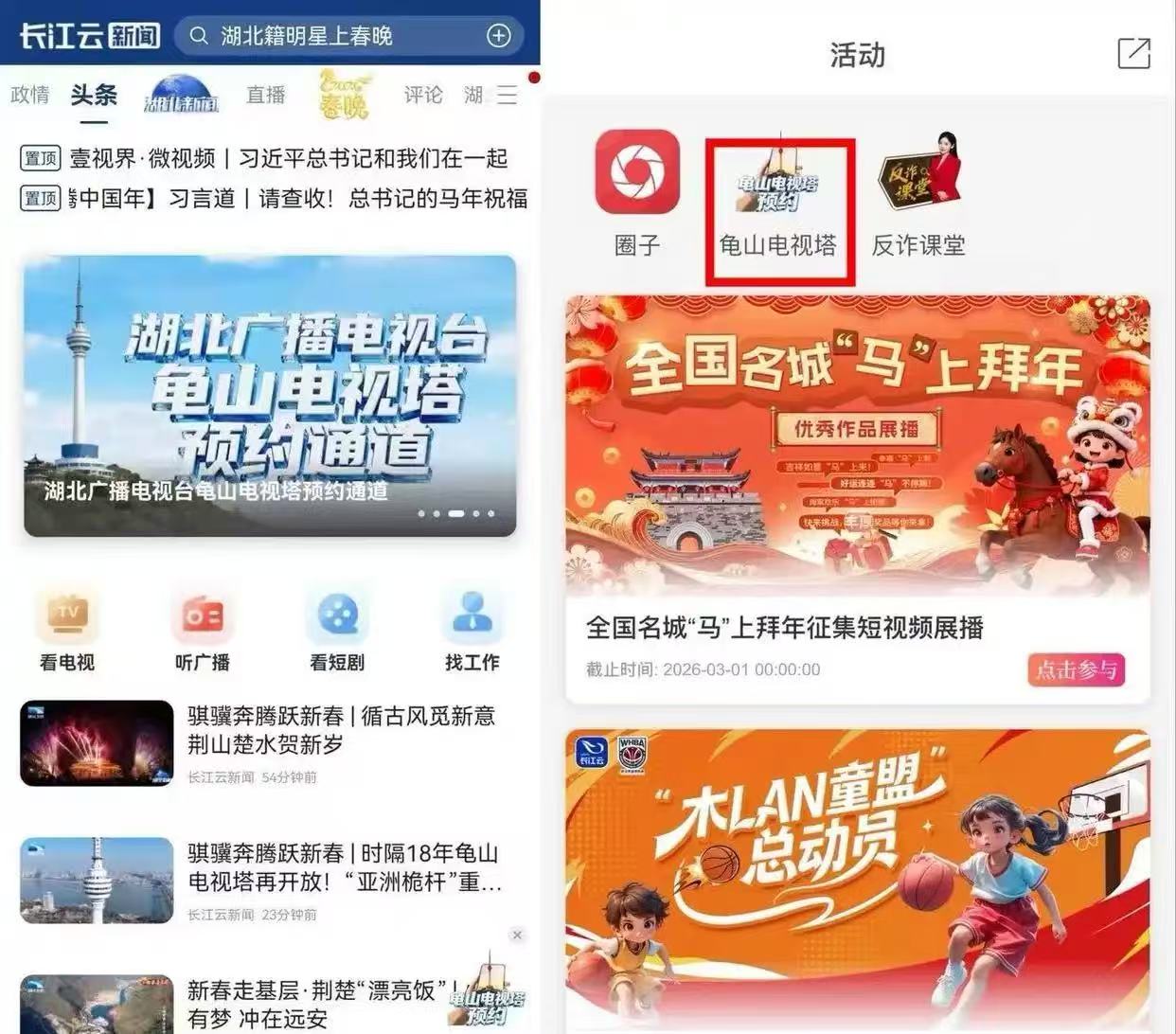 想要预约登塔的游客,请下载长江云新闻客户端,首页点击【龟山电视塔预约通道】头图,或者点击【活动】,进入龟山电视塔预约通道。