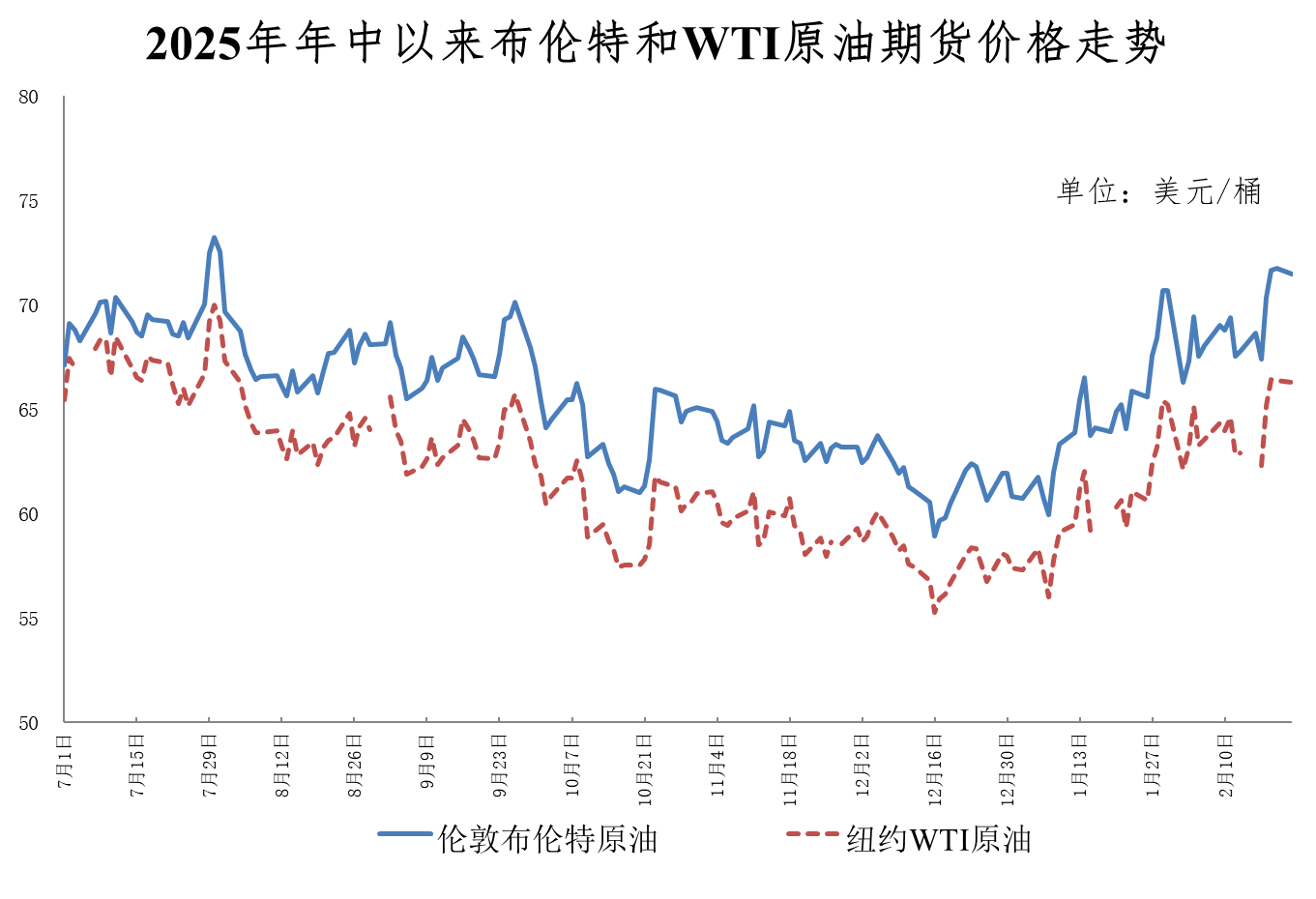 调价周期内,地缘政治风险上升主导国际油价震荡上行。一是美伊紧张局势骤然升级。伊朗在霍尔木兹海峡开展军事演习,一度关闭部分海域,而美方持续在中东地区增派军事力量,加剧市场恐慌情绪。二是俄乌会谈进展缓慢。俄乌在日内瓦举行的最新和平会谈仅持续两小时便结束,未取得任何突破性进展,相互军事打击仍在持续,和谈前景艰难且不确定。此外,美国冬季风暴导致原油产量下滑,加之美国原油库存超预期大幅下降,进一步提振油价。调价周期内,布伦特原油期货价格一度升至72美元,为2025年7月以来高位。