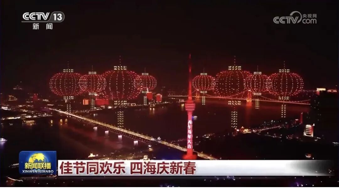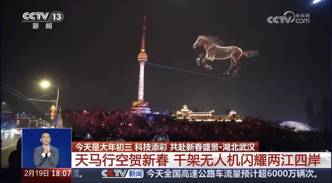 2月19日大年初三,CCTV-13《共同关注》、《新闻联播》,纷纷聚焦长江边的4000架无人机光影秀。