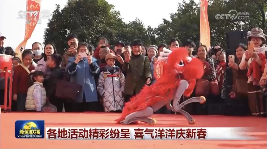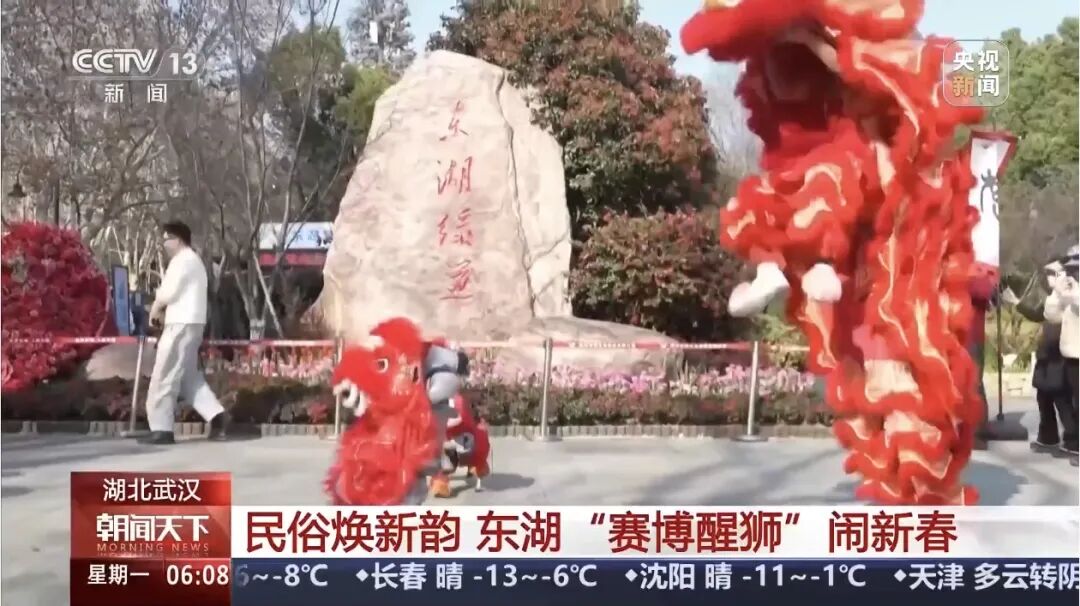 2月23日大年初七,CCTV-13《朝闻天下》,以《民俗焕新韵 东湖“赛博醒狮”闹新春》为题,聚焦武汉东湖绿道的舞龙舞狮表演。科技赋能民俗,披醒狮装扮的仿生机器狗,与传统队伍默契互动,看完的游客一脸兴奋表示“好新奇”。