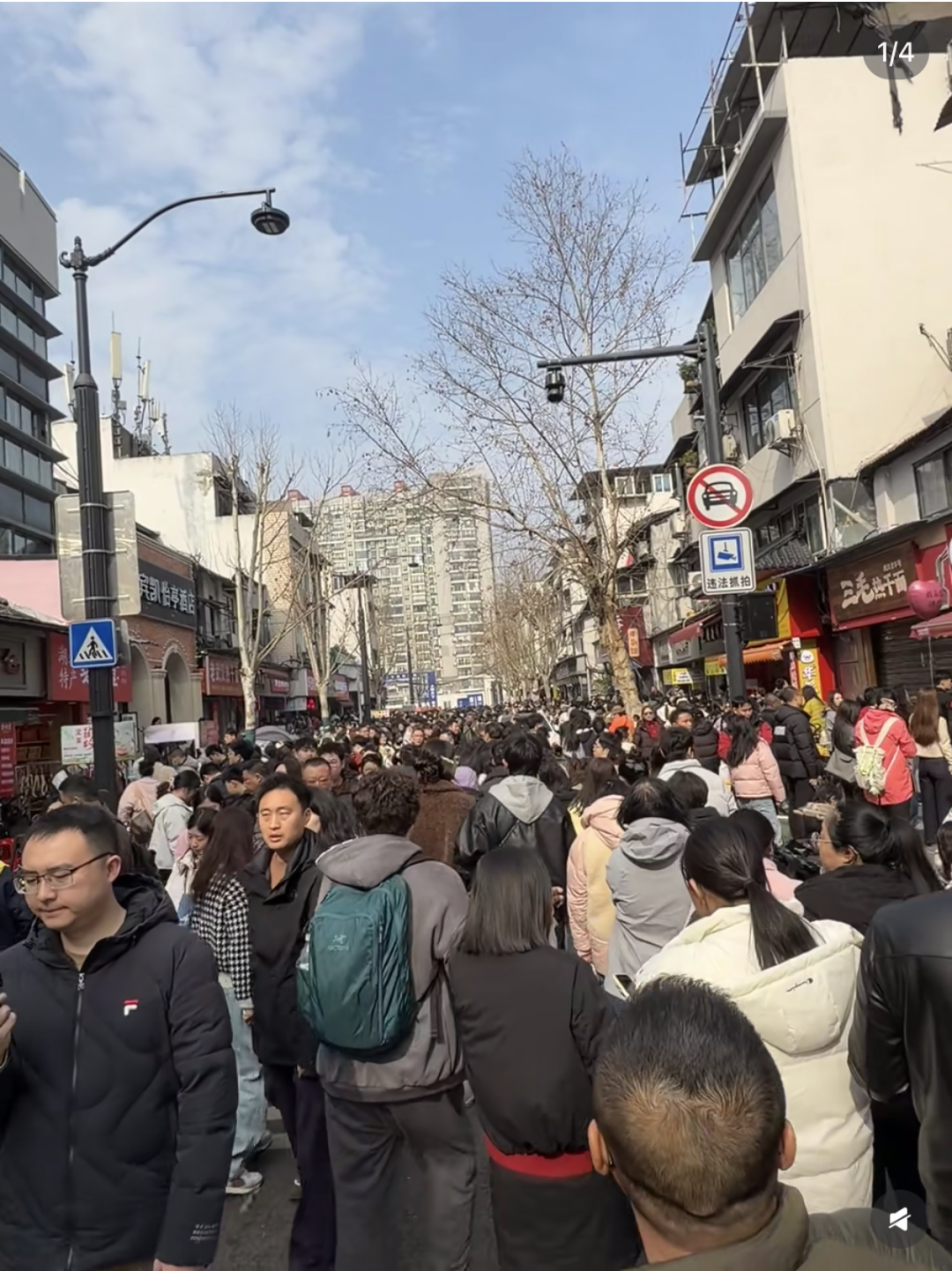 在黄鹤楼,工作人员古装上岗,奏乐、演绎故事等,氛围沉浸,园区一度连发三日“客流预警”。2026年春节小长假前八天,黄鹤楼公园游客量超29万人,同比2025年同期增长37.5%。