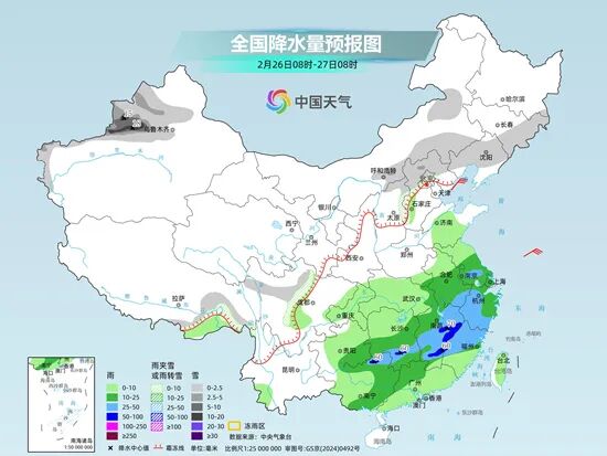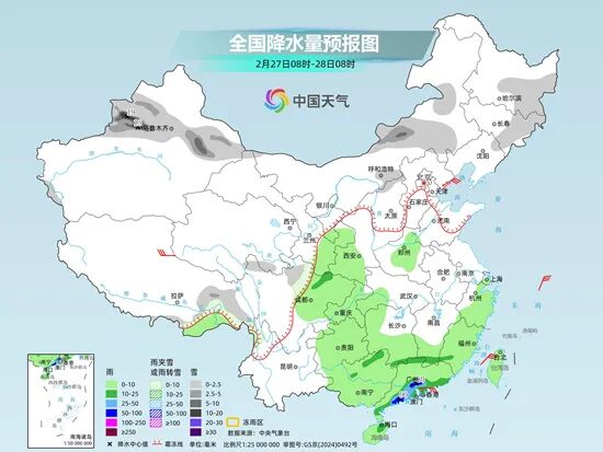 明天,内蒙古东南部和中部、东北地区东部和南部、新疆西北部、西藏东部、华北北部、川西高原北部等地部分地区有小雪或雨夹雪,其中,新疆北疆北部和伊犁河谷等地部分地区有中到大雪,新疆伊犁河谷等地局地暴雪。江淮大部、江南大部、华南北部、广西东部等地部分地区有中到大雨,其中,湖南南部、江西中南部、福建西北部、广西东北部等地部分地区有暴雨。