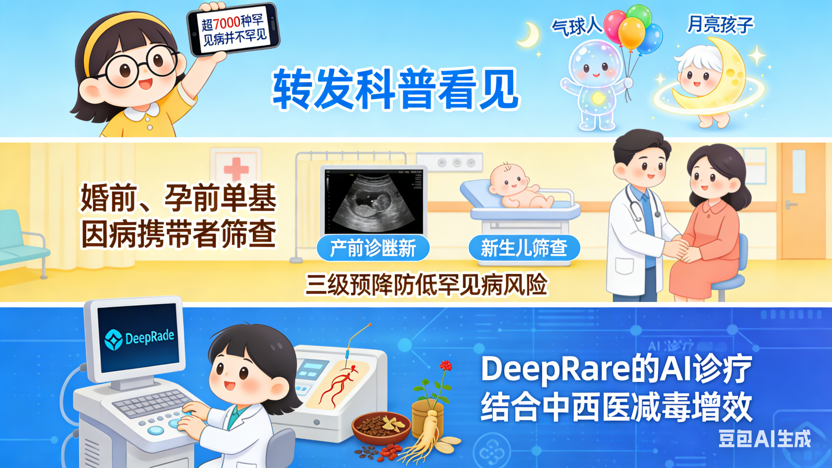 预防在前:通过婚前、孕前的单基因病携带者筛查,以及产前诊断和新生儿筛查这 “三级预防” ,可有效降低罕见病发生风险。