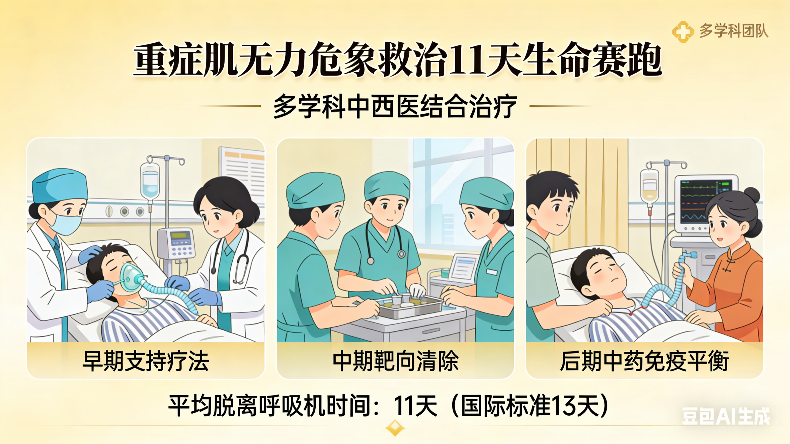 在重症肌无力危象(呼吸衰竭)救治中,该院多学科团队采用中西医结合治疗:早期支持疗法度过危象、中期靶向清除、后期中药免疫平衡。该院团队数据显示,患者平均脱离呼吸机的时间缩短至11天 ,优于国际标准的13天 。