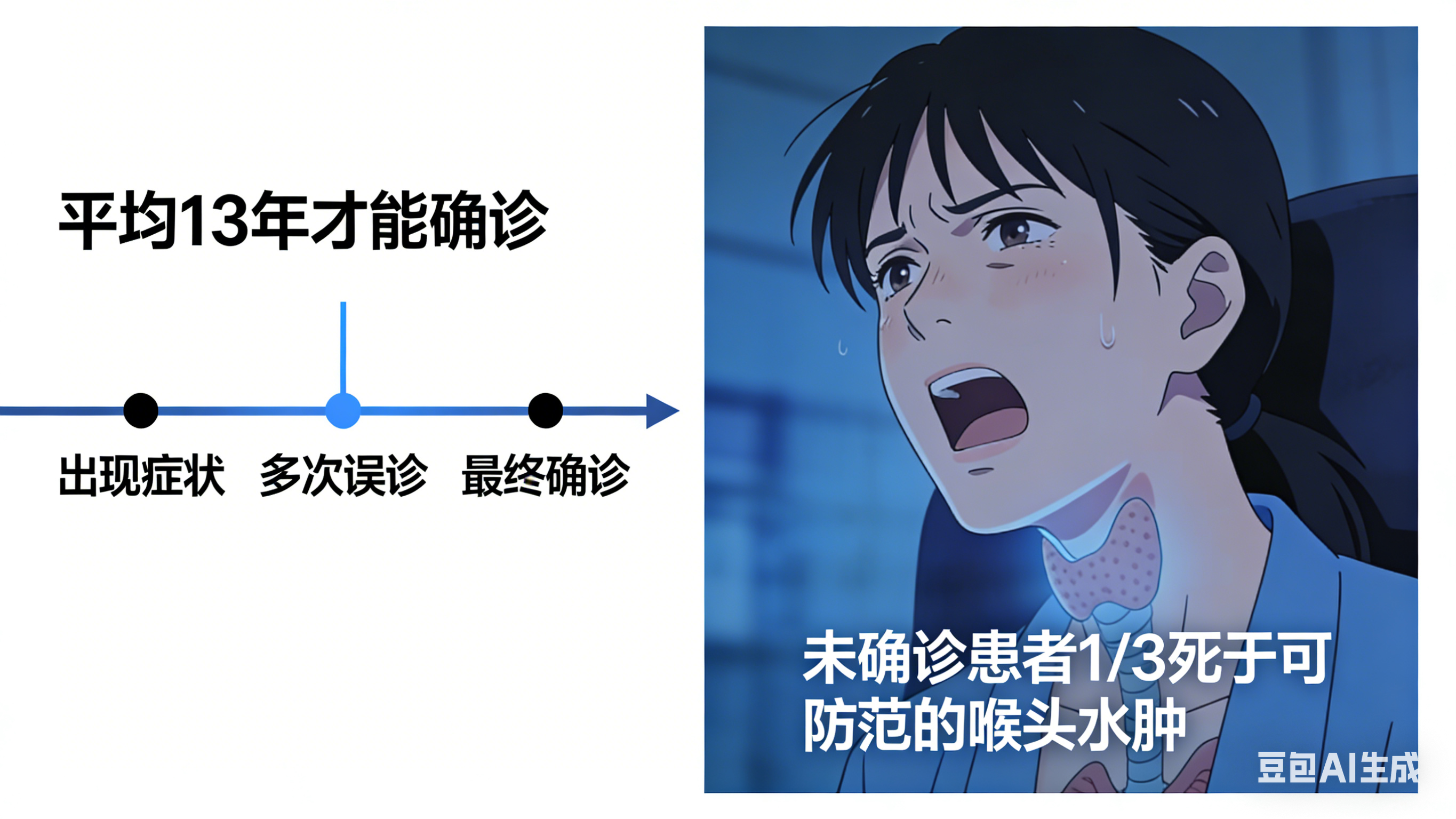更令人揪心的是——误诊:遗传性血管性水肿患者平均需要13年才能确诊;而在未诊断的患者中,有1/3死于本可防范的喉头水肿。