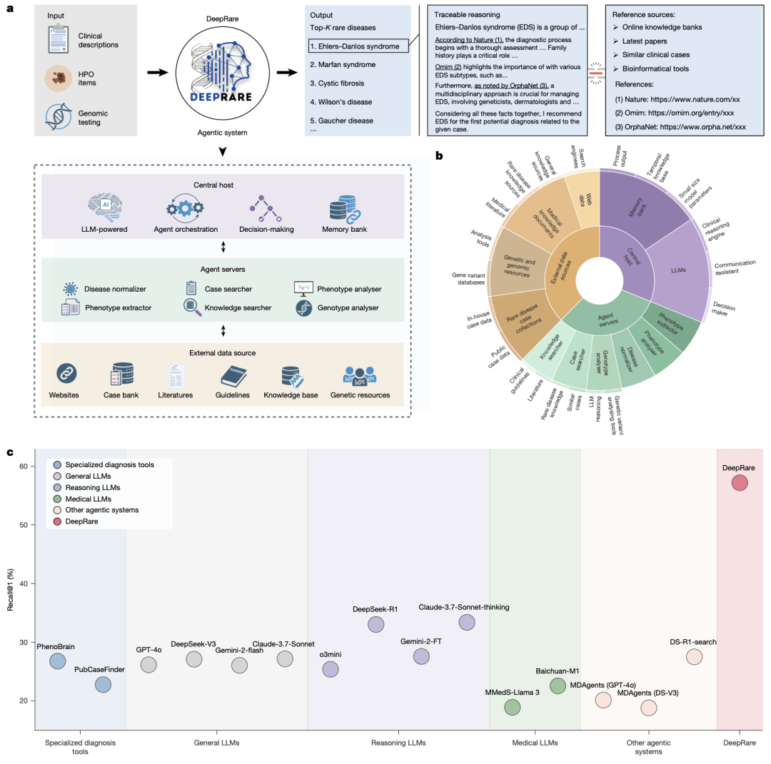 上海交通大学医学院附属新华医院与上海交通大学团队联合在顶级期刊 《自然》 上发表了一款名为 “DeepRare” 的AI智能体诊断系统。这不仅仅是一个数据库,而是一个会像人类医生一样“思考”的虚拟专家会诊中心。