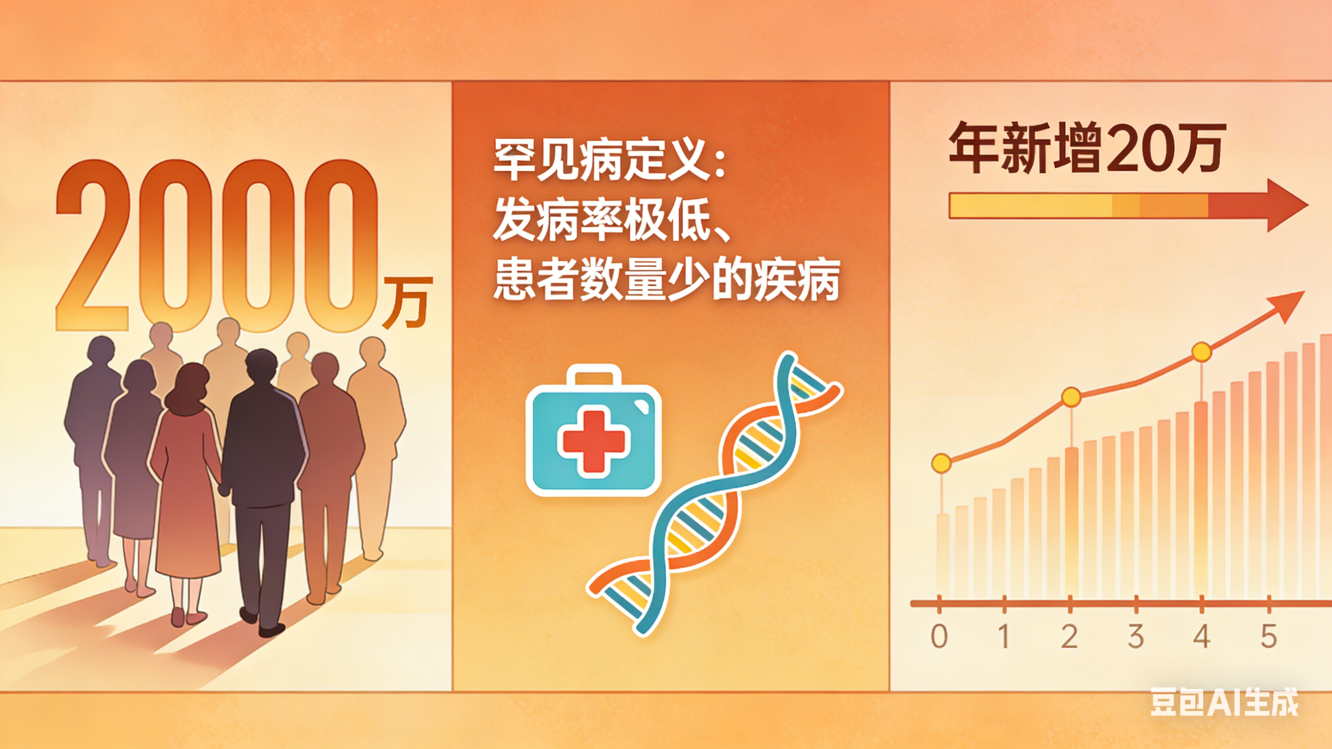 罕见病,指新生儿发病率小于1/100000、患病人数小于14万的疾病。目前中国有2000万罕见病患者,每年新增超20万。