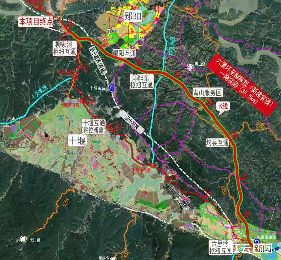 该项目建设里程约39.5公里,估算总投资85.37亿元,起点自丹江口市六里坪(枢纽)互通,向西采用新线扩容方案,经均县镇,郧阳区青山镇、茶店镇,止于柳陂镇,顺接G70福银高速公路十漫段。新建复线六里坪至柳陂段采用双向六车道高速公路标准建设,设计速度100公里/小时,整体式路基宽度33.5米,单侧分离式路基宽度16.75米;局部改扩建过渡段沿现有老路采用两侧拼宽的方式改扩建为双向八车道,设计速度100公里/小时,整体式路基宽度41米。