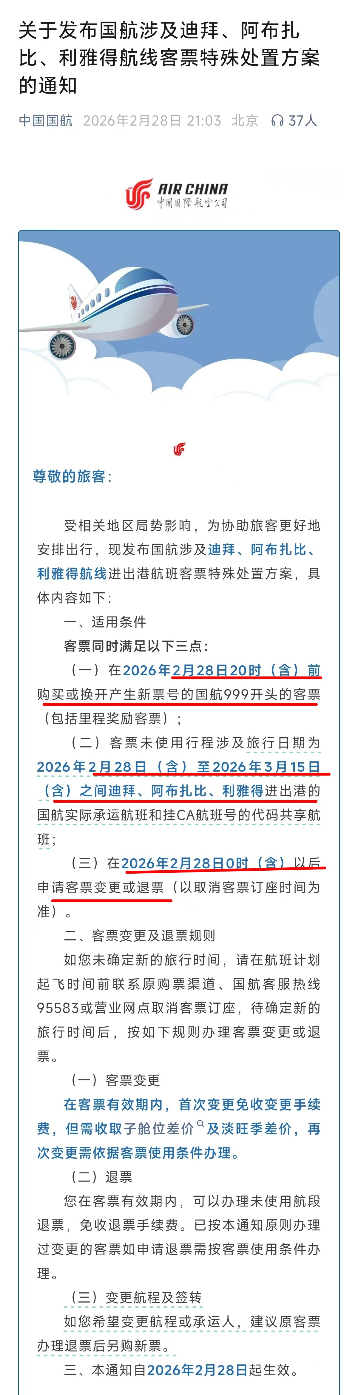 国航通知显示,旅客于2026年2月28日20时(含)前购买的机票,旅行日期在2026年2月28日至3月15日(均含当日)之间的迪拜、阿布扎比、利雅得进出港航班,可申请变更或退票,首次变更免收手续费,但需补舱位差价。