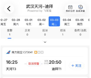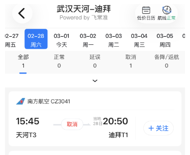 记者了解到,原计划于2月28日15:45由武汉直飞迪拜的南方航空CZ3041航班已确认取消。
