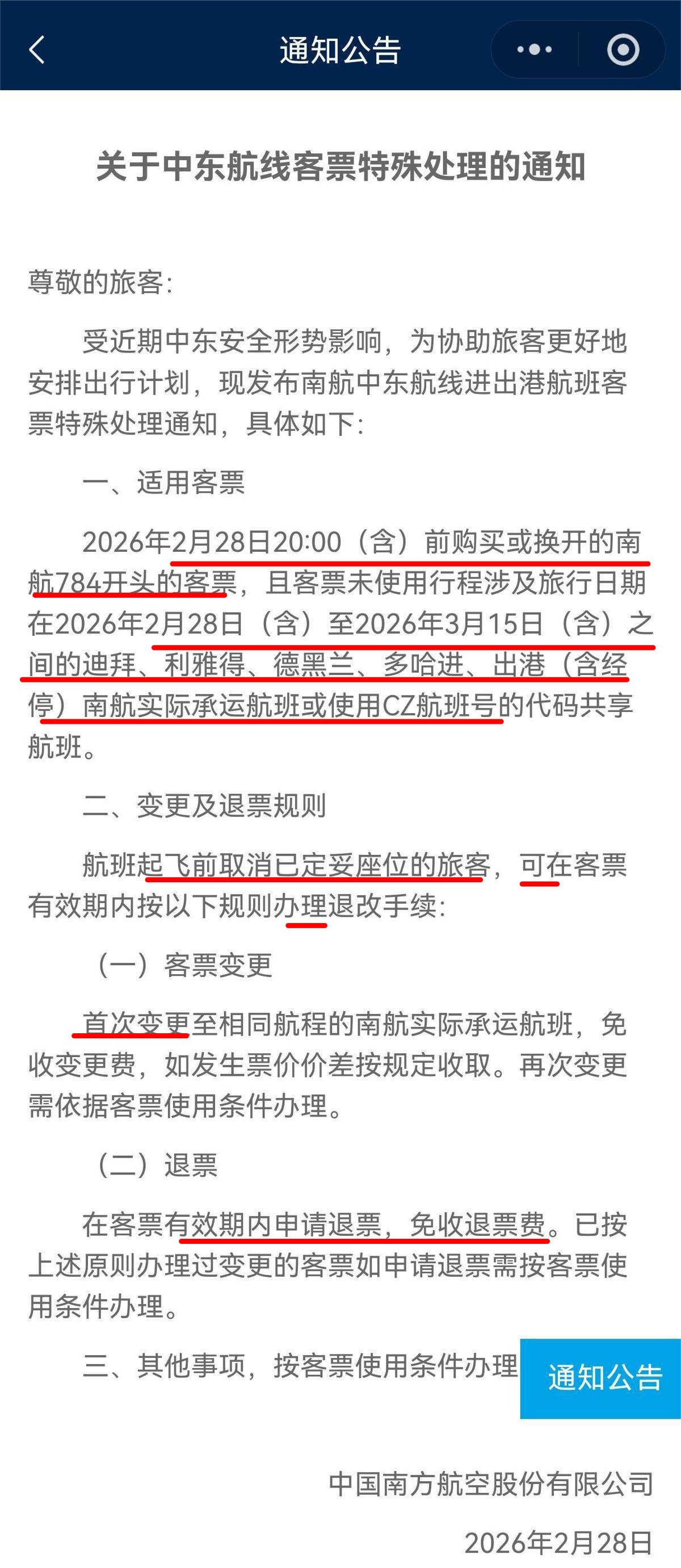 南航方案中,旅客购买的涉及迪拜、利雅得、德黑兰、多哈的进出港(含经停)航班机票,同样针对2026年2月28日20:00(含)前购买、旅行日期在2月28日至3月15日之间的机票,可免费变更一次。