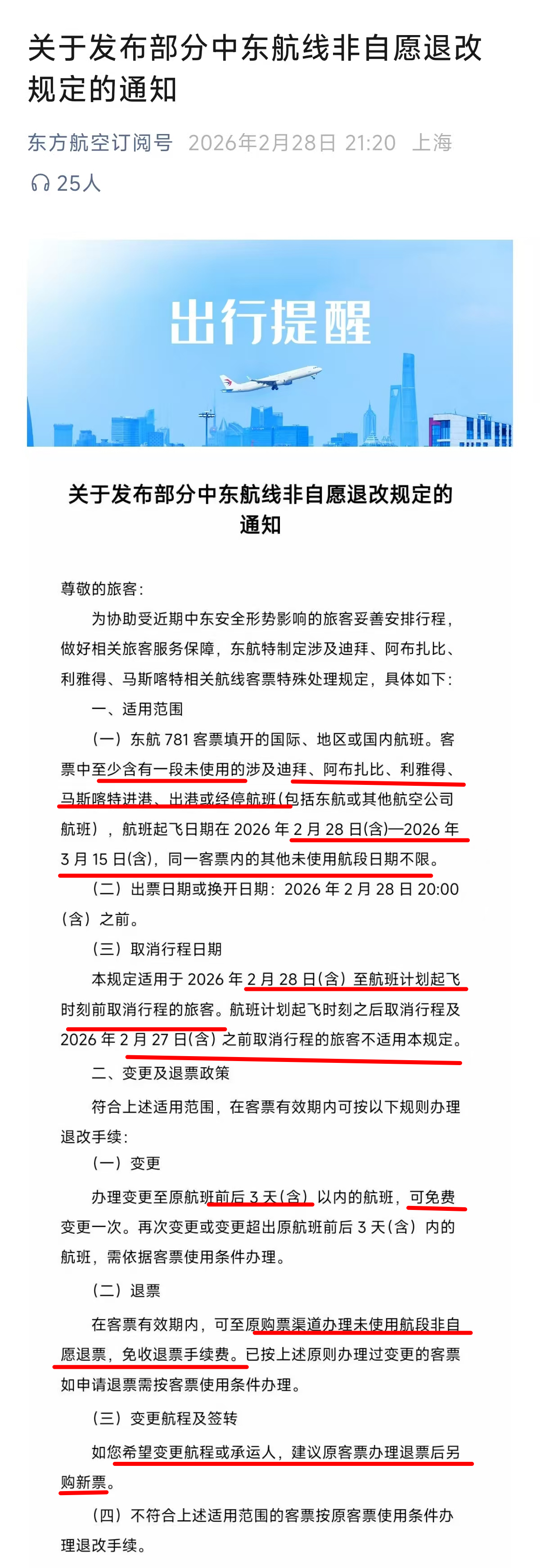 东航规定,旅客购买的机票至少含有一段未使用的涉及迪拜、阿布扎比、利雅得、马斯喀特的进港、出港或经停航班,航班起飞日期在2026年2月28日(含)至2026年3月15日(含),可免费变更一次至原航班前后3天(含)以内的航班。