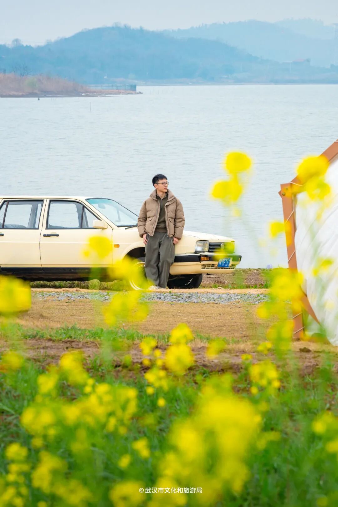 在武汉经开军山街道黄陵中学附近,有两处油菜花田,一处位于状元湖边,十分壮观;一处位于官莲湖边,可露营看夕阳。