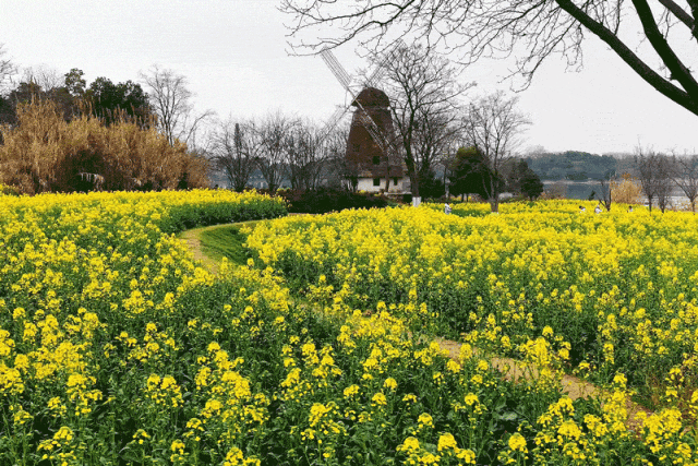 东湖万国公园的油菜花每年春天都开得很美,雪白的梨花更是点睛之笔,像金色海洋里的白色浪花。