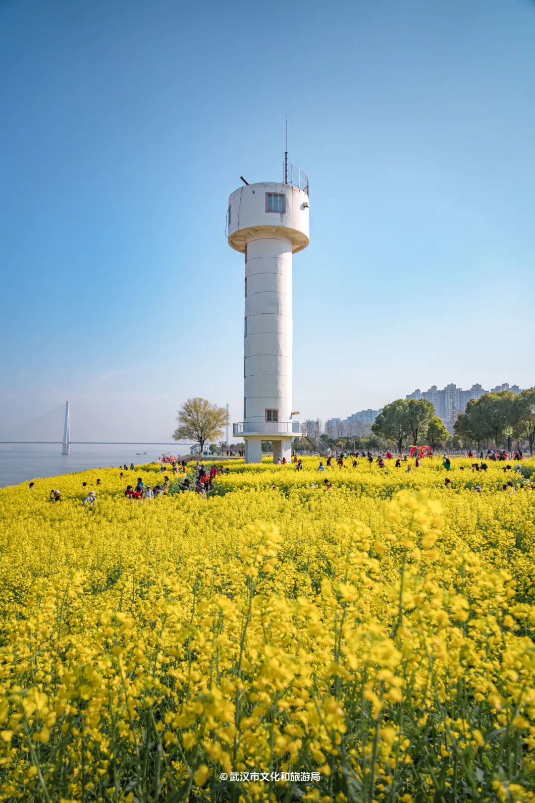 武昌江滩的油菜花位于铁机路江滩灯塔下,规模不大,但位于市中心,交通便利。油菜花田被小路分割成大大小小的几块,方便游客打卡。