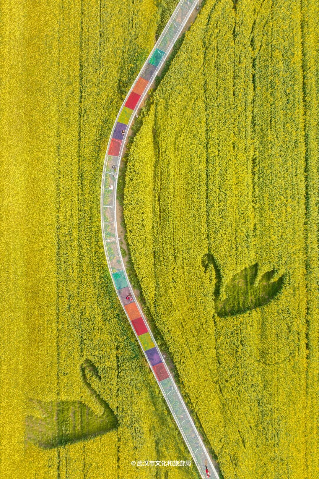 消泗油菜花海景区是武汉唯一以油菜花为主题的景区,300多米长的彩虹色玻璃栈桥在广达800亩的花海上蜿蜒,晴天时金灿灿的非常壮观。