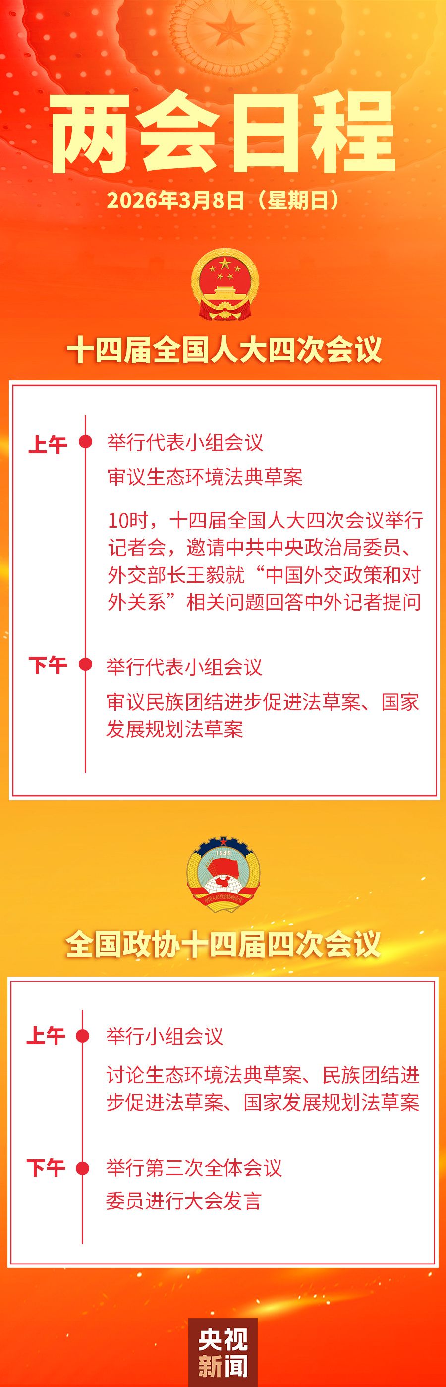 8日,十四届全国人大四次会议全天举行代表小组会议,上午审议生态环境法典草案,下午审议民族团结进步促进法草案、国家发展规划法草案。全国政协十四届四次会议8日上午举行小组会议,讨论生态环境法典草案、民族团结进步促进法草案、国家发展规划法草案;下午举行第三次全体会议,委员进行大会发言。
