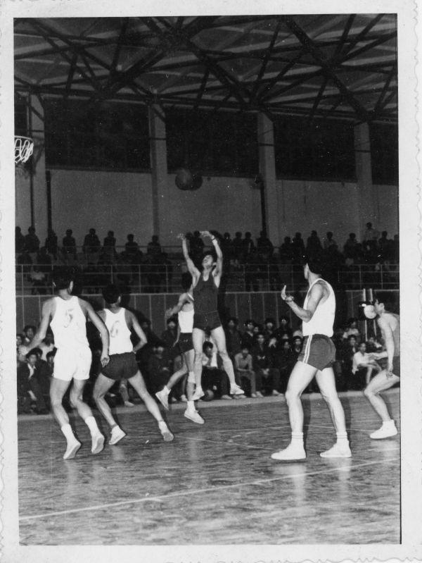 (上世纪八十年代初,武师汉口分院篮球队在校体育馆与交通部二航局队比赛。)
