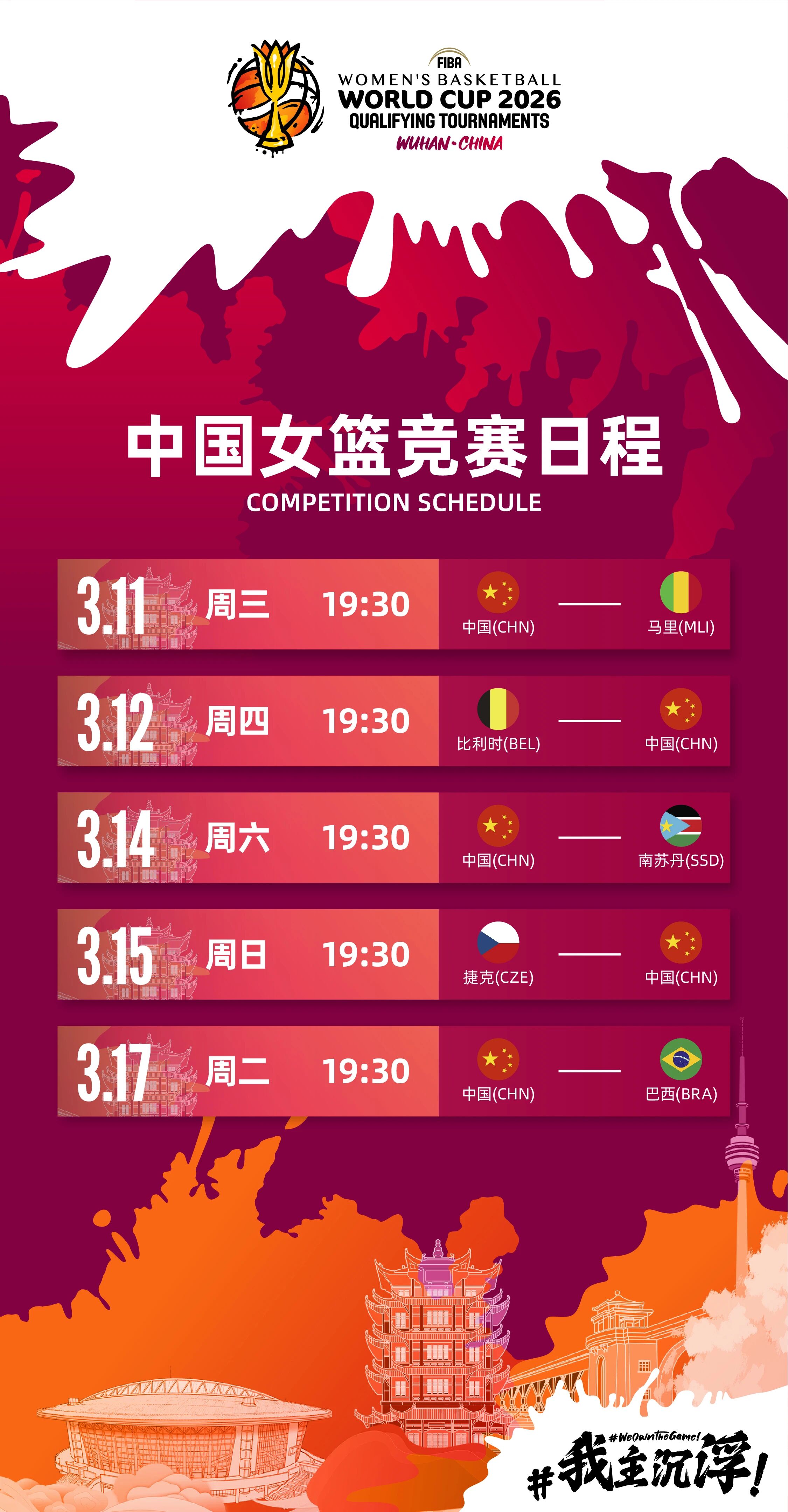 中国女篮将坐镇武汉主场,与巴西、捷克、马里、南苏丹等劲旅同台竞技,全力冲击2026年柏林世界杯正赛资格。7天5赛的高密度赛程,场场关乎出线命运。此外,这次比赛,韩旭、李月汝两大内线核心将归队,杨舒予等人气选手领衔,赛事尚未启幕,期待已燃遍全城。