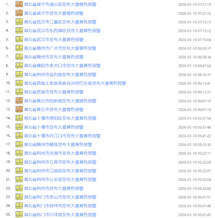 黄石市气象台2026年03月10日06时01分发布大雾橙色预警信号:目前,阳新龙港镇已经出现能见度小于200米的雾,预计今天早晨至上午仍将持续,请注意防范。