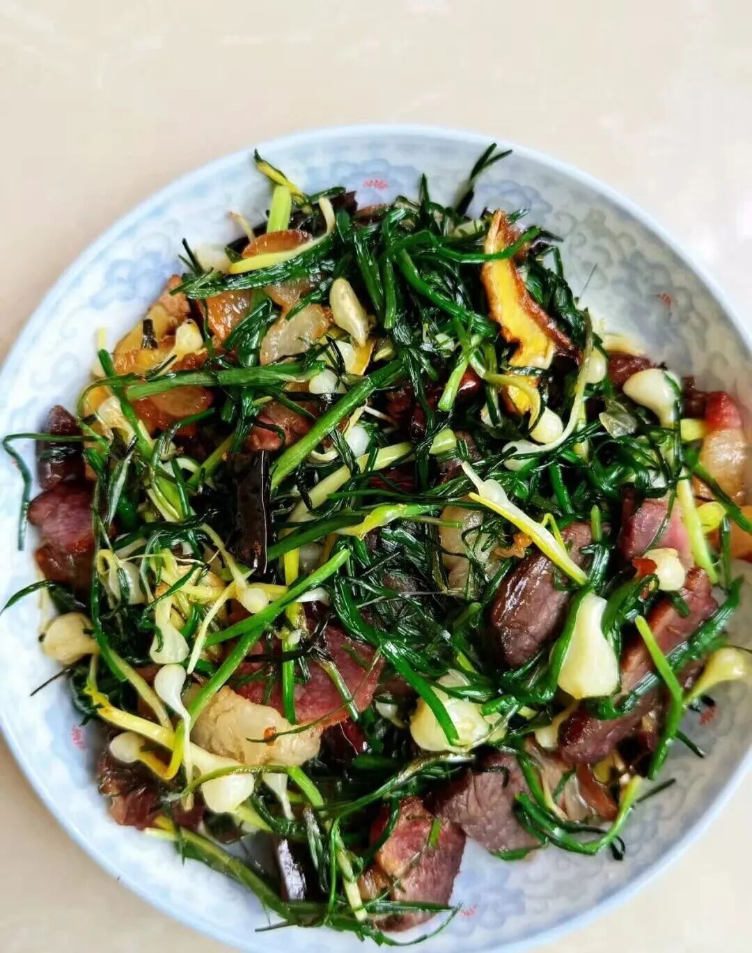 湖北人将经过一冬风霜的腊肉切薄片,下锅煸出晶莹油脂,再加入江边田埂疯长的泥蒿快速翻炒——泥蒿特有的清香被油脂激活,是鄂菜系里最春天的味道。