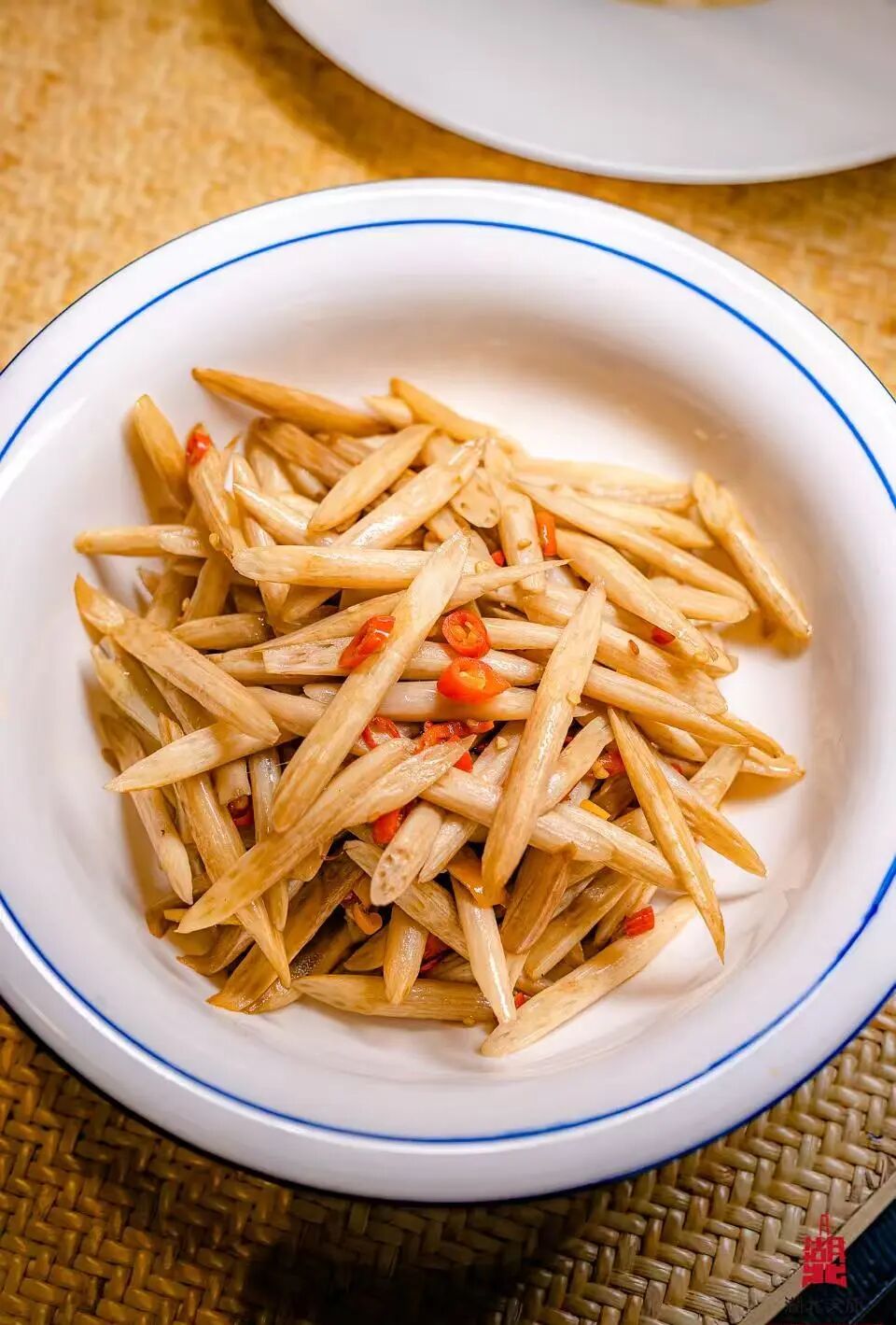 入口滑润,轻咬后嫩芽在齿间绽开,脆嫩中带着清香。因着那层天然果胶,筷子夹不起来,非得用勺子一勺入口,仿佛饮下了一汪清泉。