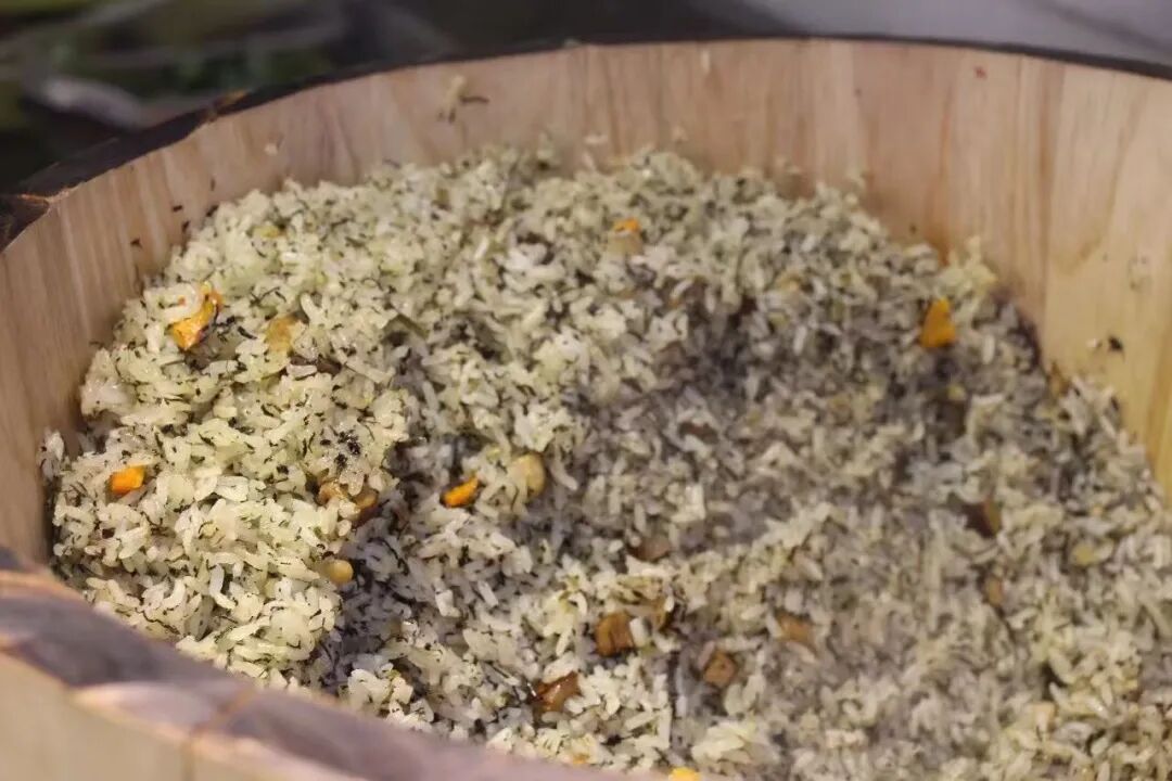社饭是恩施土家族、苗族的传统“过社”美食。糯米拌入野葱、腊肉丁、蒿菜,一同蒸熟。