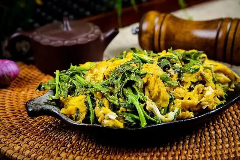 野葱炒鸡蛋也是最普遍的家常做法,野葱切碎打入土鸡蛋,加一点盐,筷子打散,热油下锅,蛋液迅速蓬松,野葱的辛香被蛋香温柔包裹,出锅装盘,黄绿相间,像极了春天的颜色。