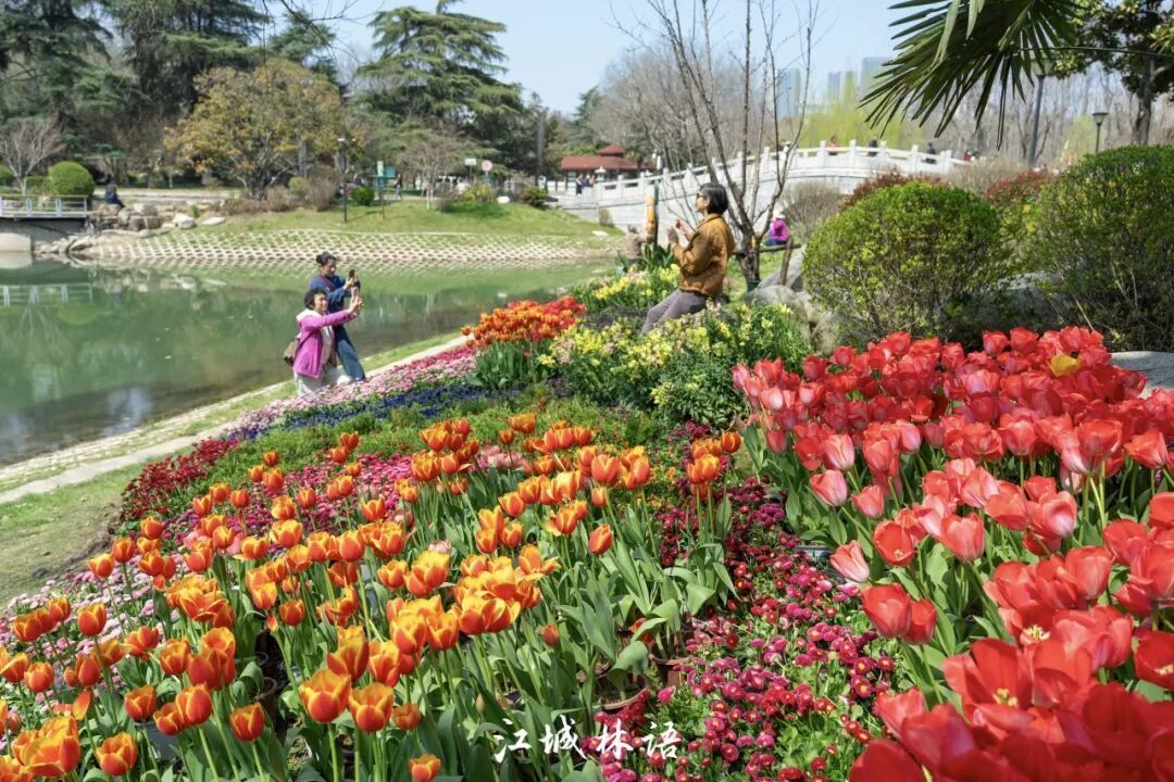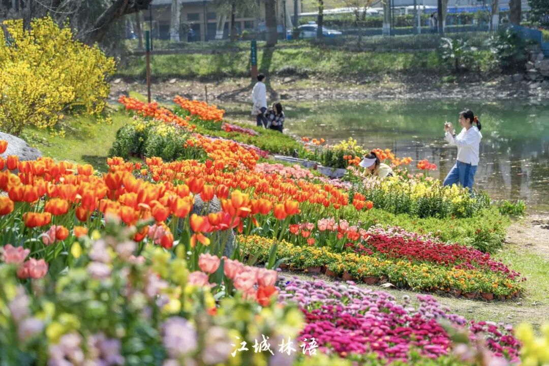 近百米长的彩色花带顺着驳岸延展,红黄相间的郁金香与紫色角堇交织,其间点缀雏菊、金鱼草等多种草花,像调色盘落在湖边。