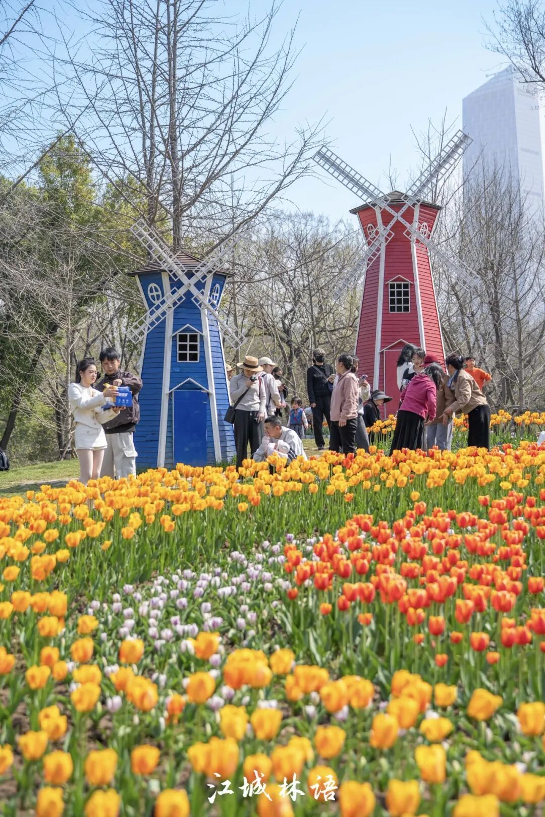 站在坡顶俯瞰,S形花径在花海中蜿蜒;走到低处仰拍,郁金香、风车与蓝天同框;再远一点,城市天际线也会悄悄进入画面。不同角度望去,每一处都像画布上的一笔春色。