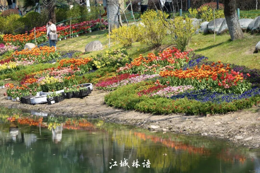 湖面上还点缀着3至4座郁金香浮岛,橙色与粉色花朵在水面轻轻摇曳,为整片湖岸增添几分灵动。