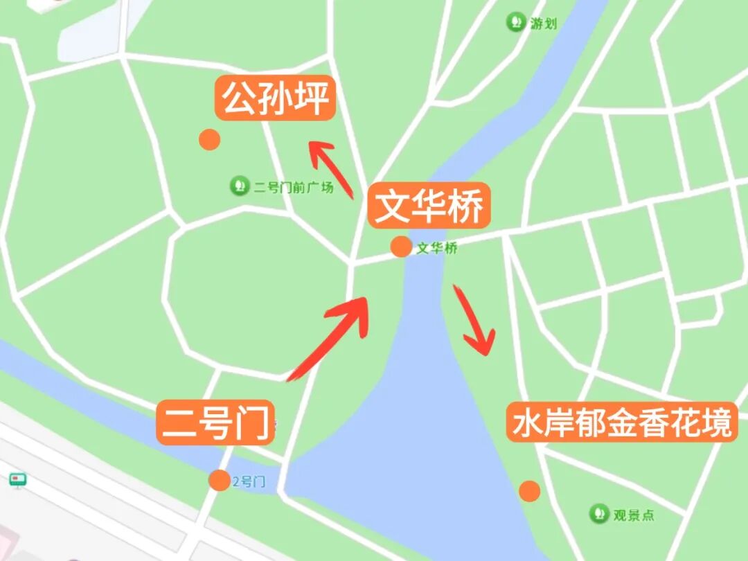 自驾游客可停在公园2号门停车点,周末建议尽量绿色出行。从2号门入园,依次经过湖岸花境、文华桥和公孙坪主花海,一圈慢慢逛下来,大约一个小时就能把这片春天看个尽兴。