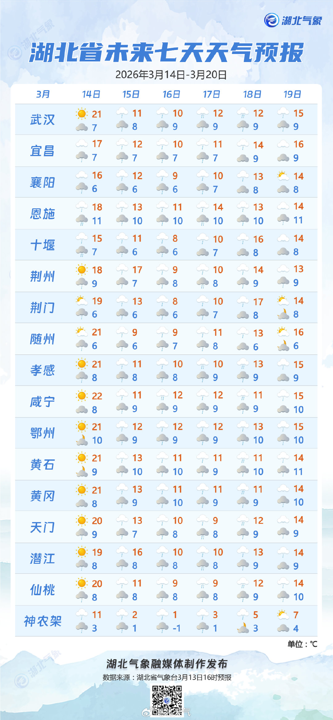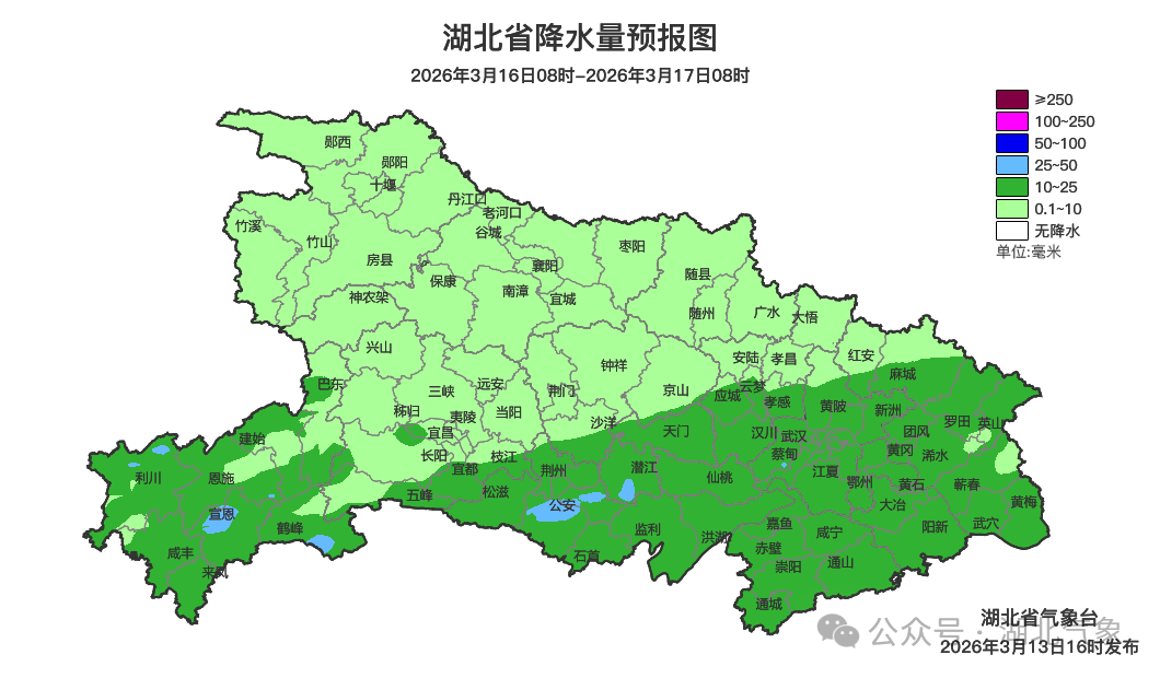 预报来源:湖北省气象台2026年3月13日16时预报