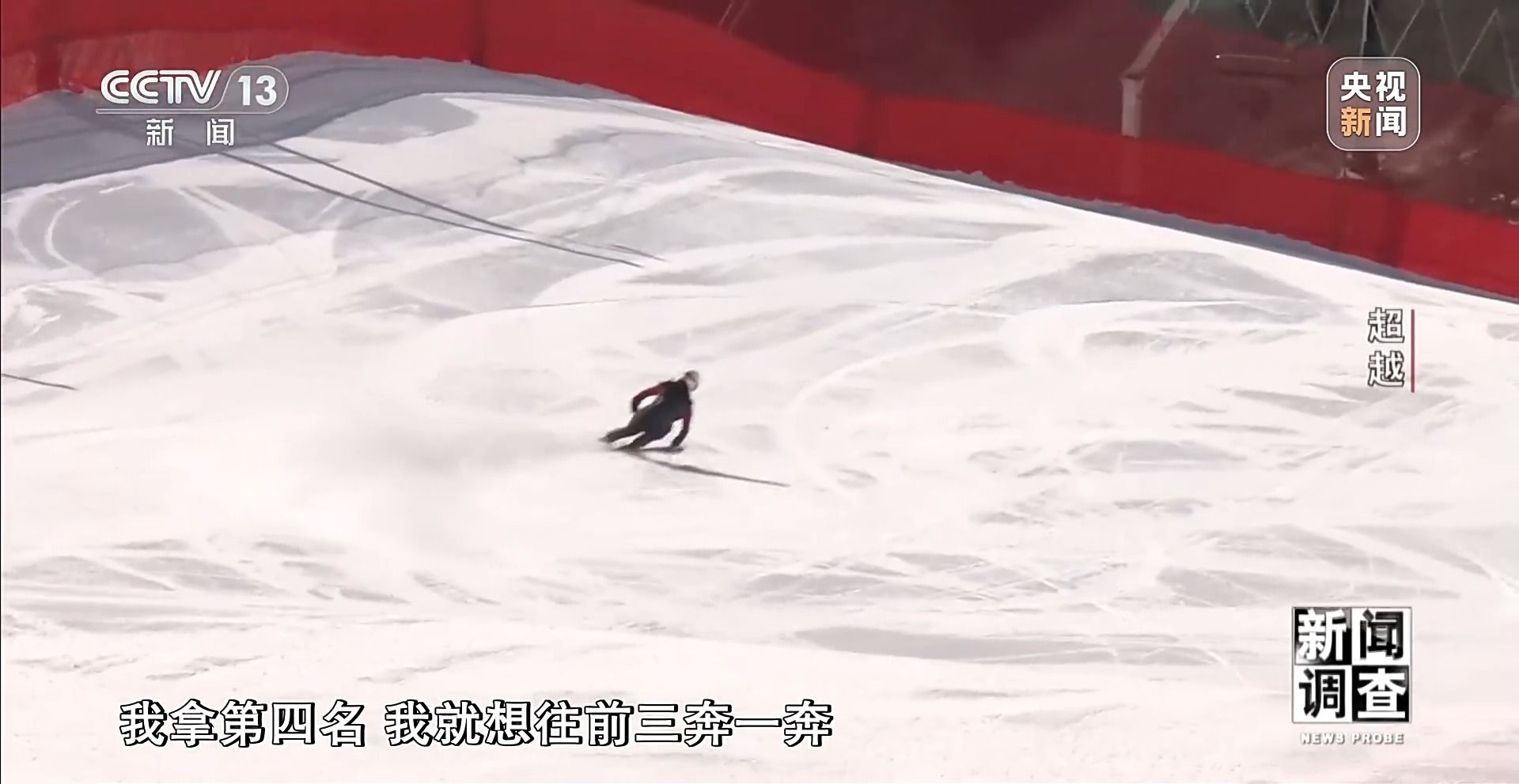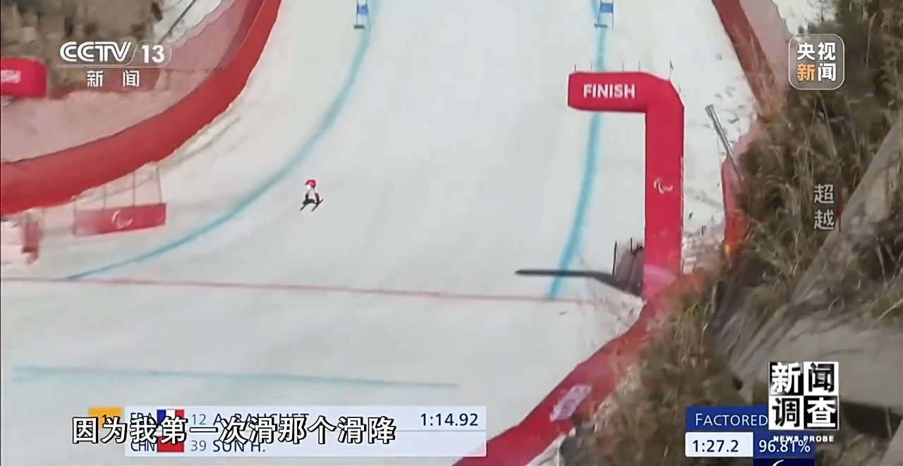 国家残奥高山滑雪队队员 孙鸿胜:毕竟我下去了,因为我第一次滑降,能完赛而且是最快的速度。我对自己已经很满意了。速度项目,稍微有一个小失误就直接就给你甩出去了,很危险。