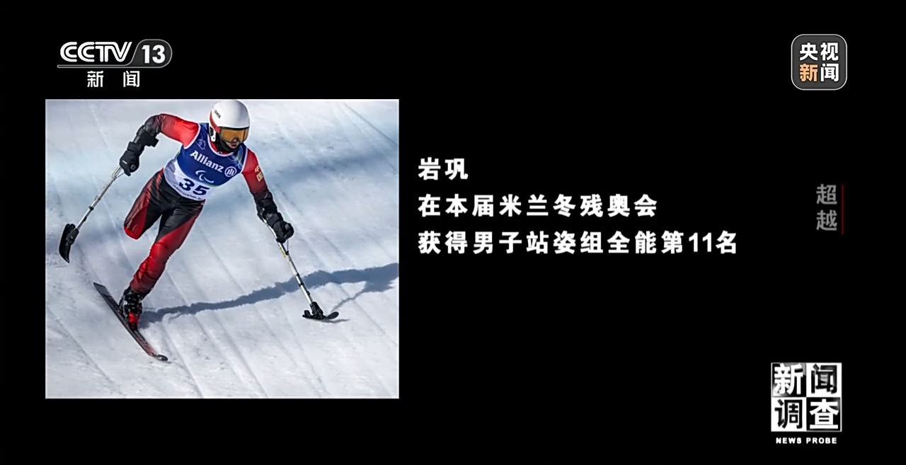 国家残奥高山滑雪队教练 王敬平:岩巩选择了站姿,一条腿滑,这是最难走的一条路。他腿的伤应该是蛮多的。