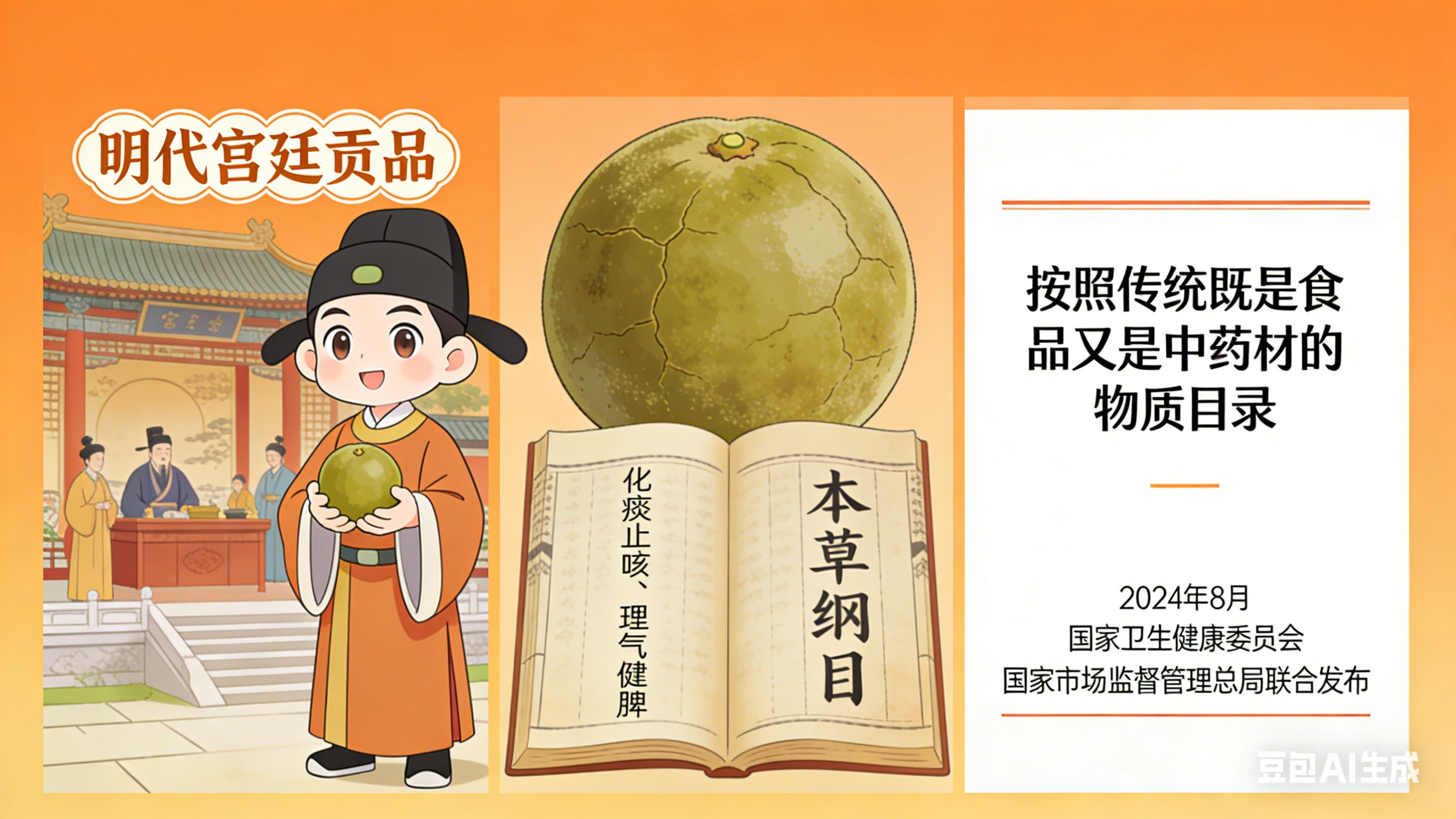 化橘红是广东化州特产,明代起便是宫廷贡品,被《本草纲目》誉为“化痰止咳、理气健脾”的佳品。2024年8月,国家卫生健康委员会、国家市场监督管理总局联合发布公告,将化橘红正式纳入“按照传统既是食品又是中药材的物质目录”。