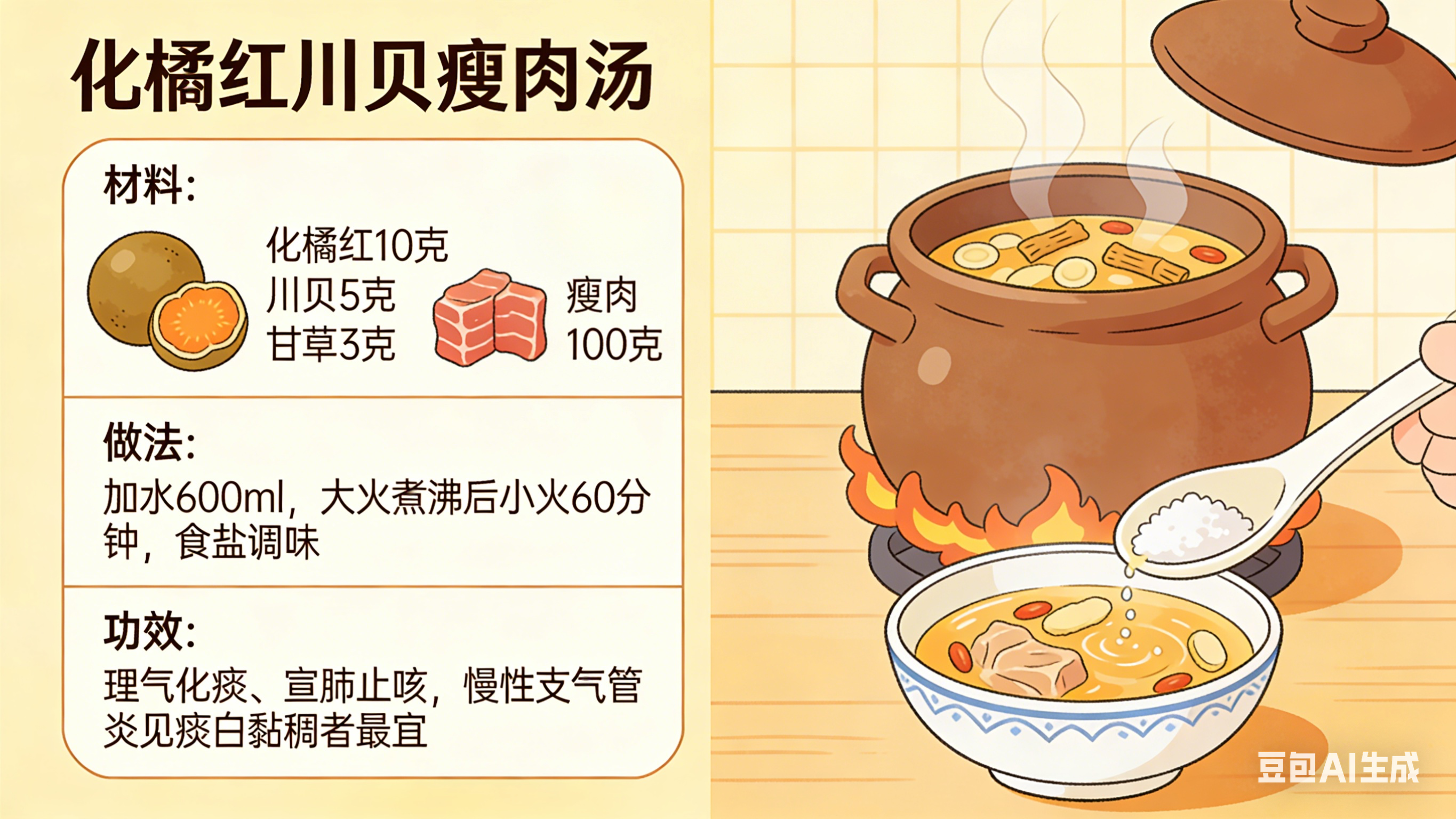 材料:化橘红10克、川贝5克、甘草3克、瘦肉100克。
